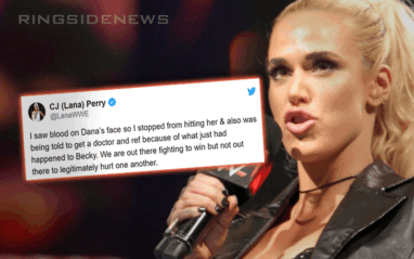 But Lana’s excuse for this extremely light work on the outside of the ring involved a couple of factors. First off, Lana said she saw blood on Dana Brooke’s face so she suddenly decided not to hit her. Also, she was being told at the same time to get a doctor because Nia Jax really did hit Becky Lynch in the ring and it exploded her nose.