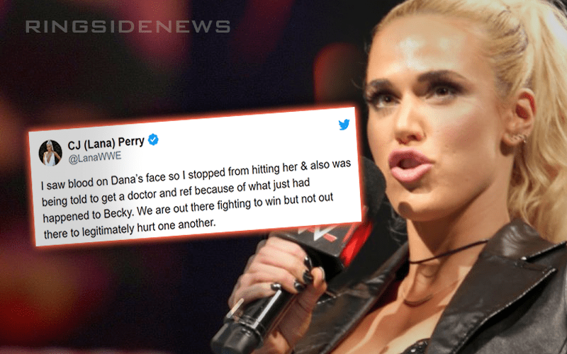 Lana was alerted to a video going around online of her pulling a punch on Dana Brooke during the SmackDown invasion angle on Raw this week. The video is a fan camera which clearly showed Lana botching an elbow and not making anywhere close to real contact which you can check out below.