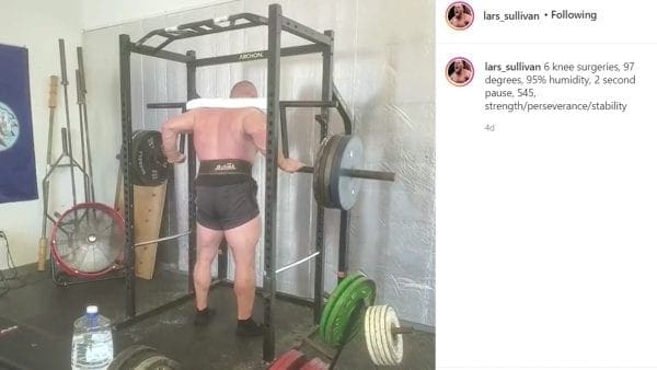 Lars Sullivan’s Instagram account is private, so we cannot embed his training videos. One video was captioned with: “6 knee surgeries, 97 degrees, 95% humidity, 2 second pause, 545, strength/perseverance/stability.”