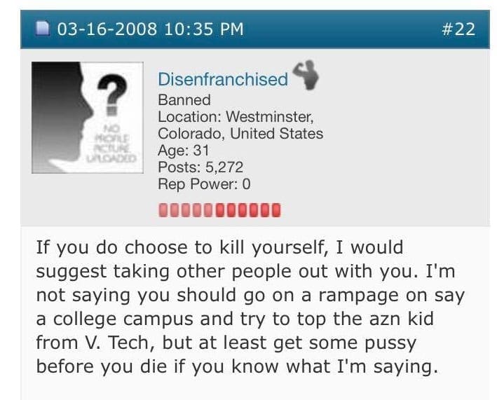 "If you do choose to kill yourself, I would suggest taking other people out with you. I'm not saying you should go on a rampage on say a college campus and try to top the azn kid from V Tech, but at least get some p*ssy before you die if you know what I'm saying."