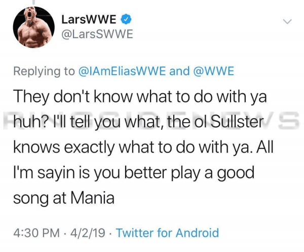 This is a pretty blatant tease that we will see Lars Sullivan at WrestleMania. John Cena is the current front runner to come out and stop Elias’ concert, but you never know if WWE could have a big surprise in store for fans at the show of shows that will see Lars Sullivan made a big impression with his main roster debut.