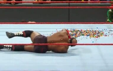 After the two battled around the ring for a bit and used a Christmas tree and presents as weapons, Lio Rush handed Lashley another gift. He opened it and poured out a box full of Legos. They teased a superplex with Lashley hitting one on Elias onto the block toys, then things got turned around for The All Mighty.