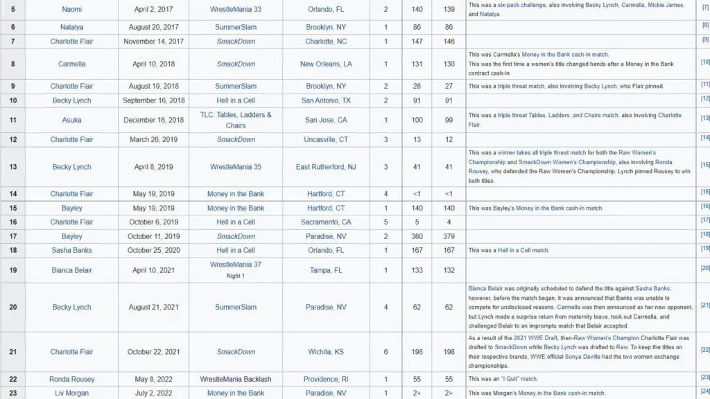 Morgan’s Smackdown Women’s Title reign might not be an incredibly long one. It remains to be seen whether Rousey will beat Morgan for the title at SummerSlam or not. You can check out the graphic below from Wikipedia to see how Liv Morgan broke that long 4 Horsewomen trend.