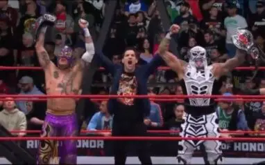The Lucha Bros. walked to the ramp where they were congratulated by former ROH World Tag Team Champions Mark Briscoe. Mark lost to Samoa Joe in a match for the ROH World Television Championship earlier during the show.
