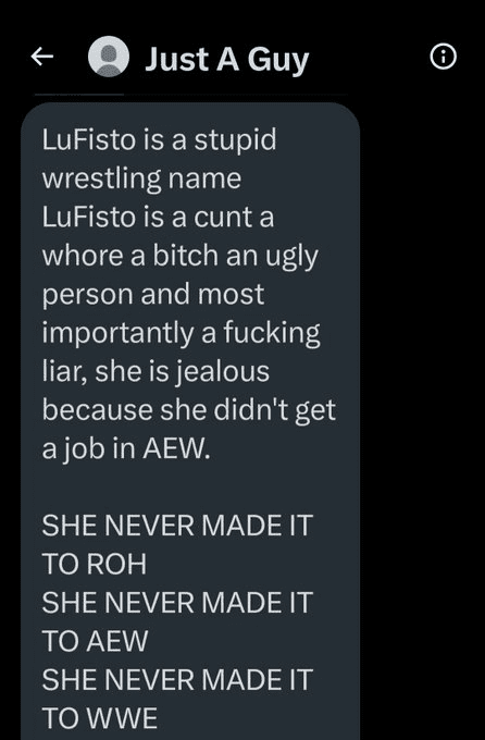 This hater went on to let Lufisto know that she didn’t make it in ROH, Impact, or WWE either. This hater really let Lufisto have it, and that’s only one of the rest hatful responses she’s received from the tribalism that is the pro wrestling fan base.