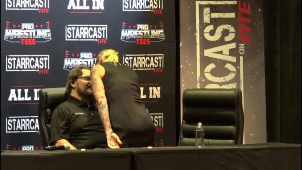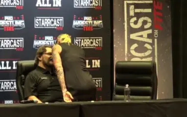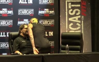We’re not very sure what went on to cause this, but at some point during the Starrcast festivities, Madusa found herself giving Schiavone a lap dance while calling him “Mr Erection.” We’re guessing Tony’s wife Lois won’t be too happy to hear about this one.