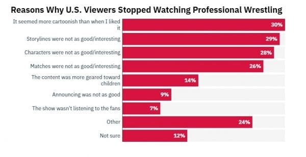 Variety attained exclusive data from YouGov that suggested the main reasons why fans stopped watching pro wrestling. The overwhelming reason given for the audience decline is a concern about the declining quality in the writing.