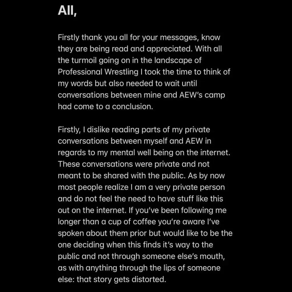 Firstly thank you all for your messages, know they are being read and appreciated. With all the turmoil going on in the landscape of Professional Wrestling I took the time to think of my words but also needed to wait until conversations between mine and AEW's camp had come to a conclusion.