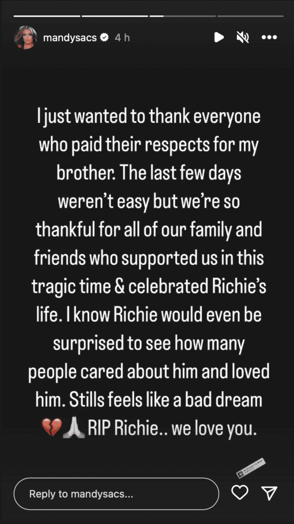 "I just wanted to thank everyone who paid their respects for my brother. The last few days weren't easy but we're so thankful for all of our family and friends who supported us in this tragic time & celebrated Richie's life. I know Richie would even be surprised to see how many people cared about him and loved him. Still feels like a bad dream. RIP Richie.. we love you," Rose wrote.
