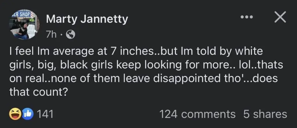 "I feel I'm average at 7 inches … but I'm told by white girls, big, black girls keep looking for more … lol … that's on real … none of them leave disappointed tho … does that count?"