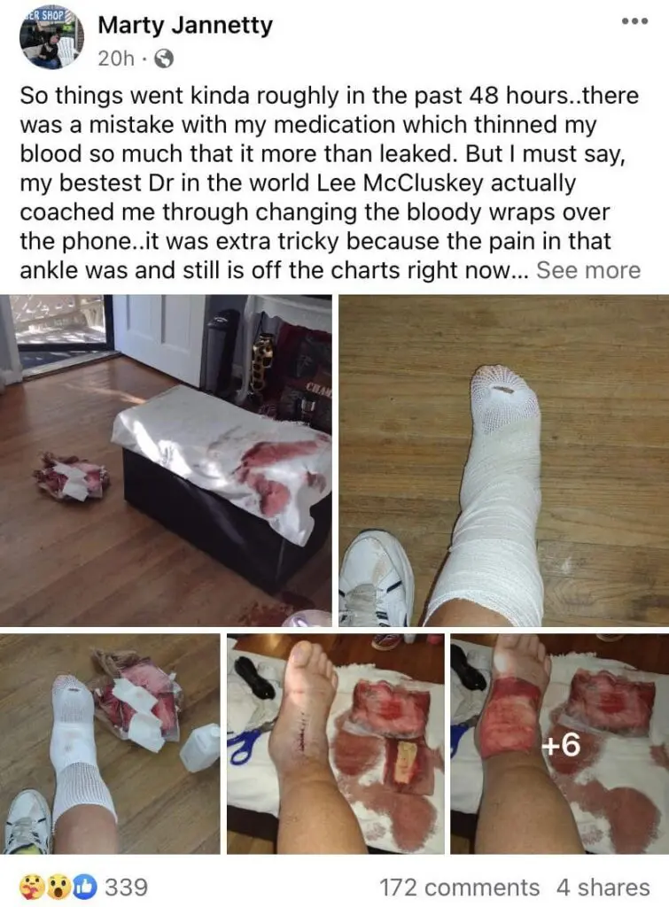 Marty Jannetty posted on Facebook to let fans know about a terrible turn for his foot health. He apparently mistook his medication, and it thinned his blood that he started leaking. He had to apply his own wrapping, and he’s getting good at it as well.