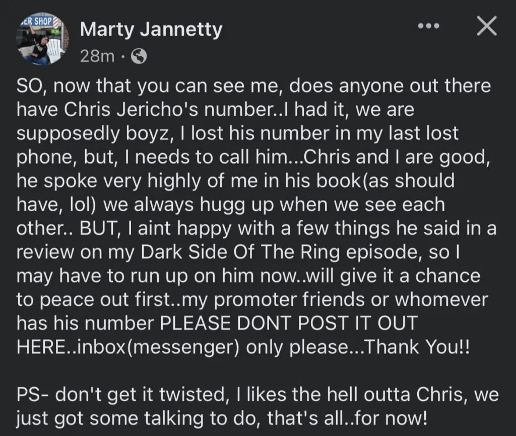 Marty Jannetty logged onto Facebook, and he went into a strange rant about Chris Jericho, and how he has his phone number. We’re not sure what prompted this.