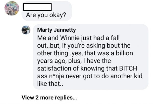 Jannetty replied to one concerned friend on Facebook who asked him if he is okay. Jannetty replied that he had a falling out with his girlfriend Winnie. He also admitted that the “other thing” was “a billion years ago.” He also has the satisfaction of knowing that “BITCH ass n*nja” never got to do that to another kid.