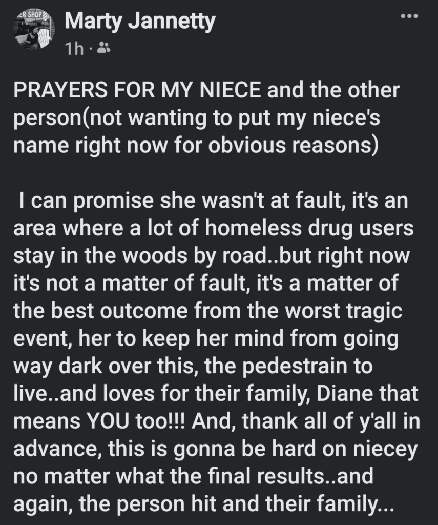 I can promise she wasn't at fault, it's an area where a lot of homeless drug users stay in the woods by road..but right now it's not a matter of fault, it's a matter of the best outcome from the worst tragic event, her to keep her mind from going way dark over this, the pedestrian to live..and loves for their family, Diane that means YOU too!!! And, thank all of y'all in advance, this is gonna be hard on niecey no matter what the final results..and again, the person hit and their family…