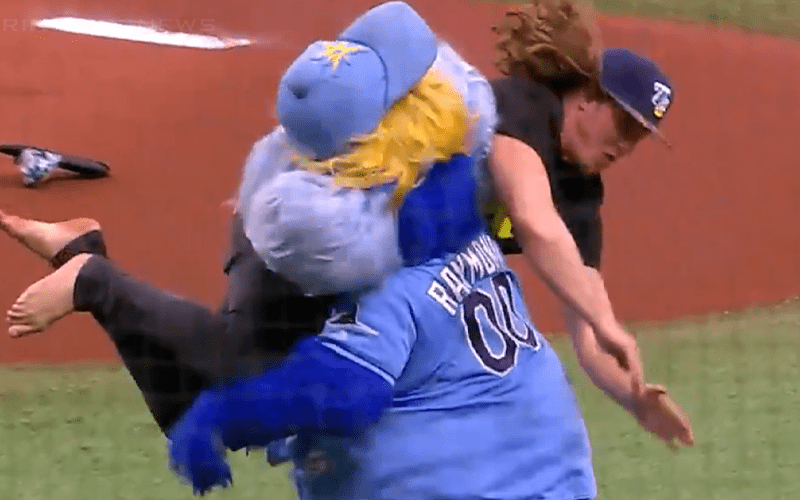 Raymond Ray is the lovable mascot of the Tampa Bay Rays, but Matt Riddle only saw something awesome that he could take out with a flying cross body. After all, Raymond was taunting Riddle a bit. So he might have had it coming.