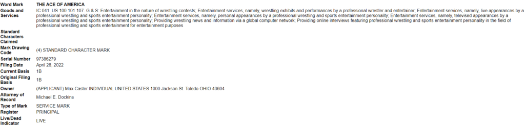 In Japanese wrestling, the “Ace” is considered the star of a company. This new filing may indicate that Max intends to take his heel persona to the international stage. The full description of the mark is standard and was filed by “Gimmick Attorney” Michael Dockins.