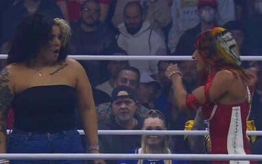 However as Mercedes Mone continued her addressal, the lights went out in the arena and came back with AEW TBS champion Julia Hart standing ringside staring across the woman whose mission was to take things globally in AEW. Moments later, Mone was attacked by Hart’s ally, Skye Blue from behind and both launched a combined assault on the CEO.