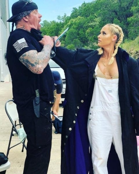 In a recently uploaded photo to Instagram, The Undertaker said that his wife put on one of his famous entrance jackets and it caused her to reenact one of his signature moves.