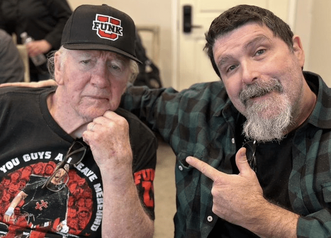 On Tuesday, Mick Foley visited Terry Funk in Amarillo, Texas. The official Twitter handle of Foley’s podcast, “Foley Is Pod” shared a picture of the two legends together complete with a caption to illustrate the photo.
