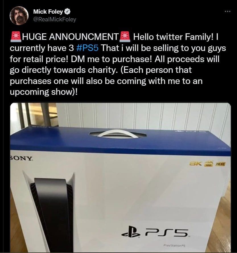 Foley’s account had an unusual tweet, which gave away the fact that he’s been hacked to those who noticed. The post talked about an offer for selling PS5 gaming consoles for a retail price. This is the same tweet that many other pro wrestlers have posted when they were hacked.