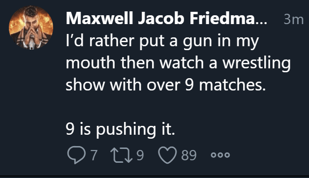 The AEW World Champion recently took to Twitter and stated that he would rather put a gun in his mouth than watch a wrestling show with over 9 matches. Unsurprisingly, he ended up deleting the tweet shortly afterwards after receiving backlash from fans on the popular social media platform.