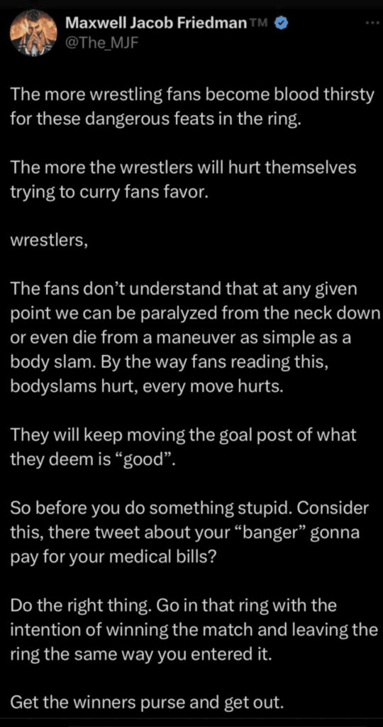 MJF took to Twitter and in a now-deleted tweet, blasted pro wrestling fans for being bloodthirsty and advised pro wrestlers to not curry the favor of those fans and focus on leaving the ring in one piece.
