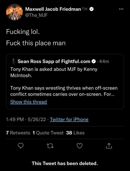 MJF even responded to reports that WWE has an interest in bringing him in. We’ll have to wait and see what’s next for the master heel. Check out the now-deleted tweet from the screenshot below.