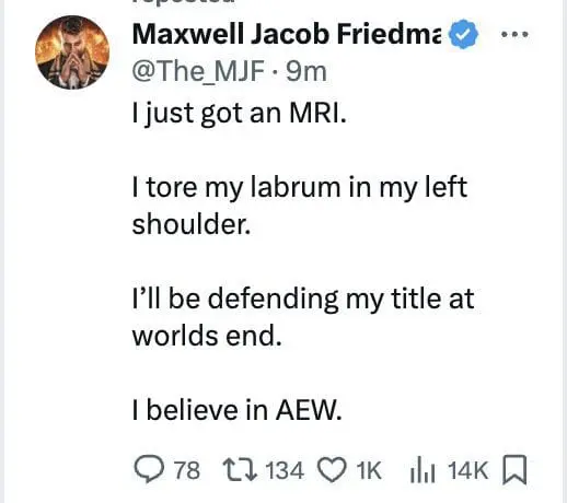 Dave Meltzer posted on X to confirm that MJF has a torn labrum. Right now, he will wrestle against Samoa Joe at AEW World End on December 30th, but he won’t be wrestling in the meantime.