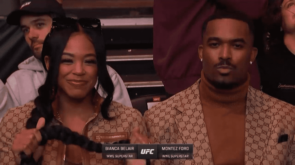 Bianca Belair and Montez Ford can be spotted sitting in the crowd twinning in light color Gucci outfits and seemingly enjoying the action taking place in the Octagon.