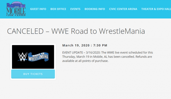 The Mobile Civic Center in Mobile, Alabama has posted that Thursday’s house show has been cancelled.