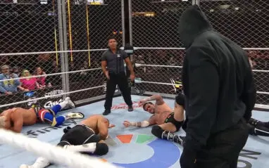 Suddenly, a masked man scaled the cage and got in the match. He stood up to CM Punk and nailed a kick to the face of Punk followed by a stomp. Then the person climbed back out of the ring.