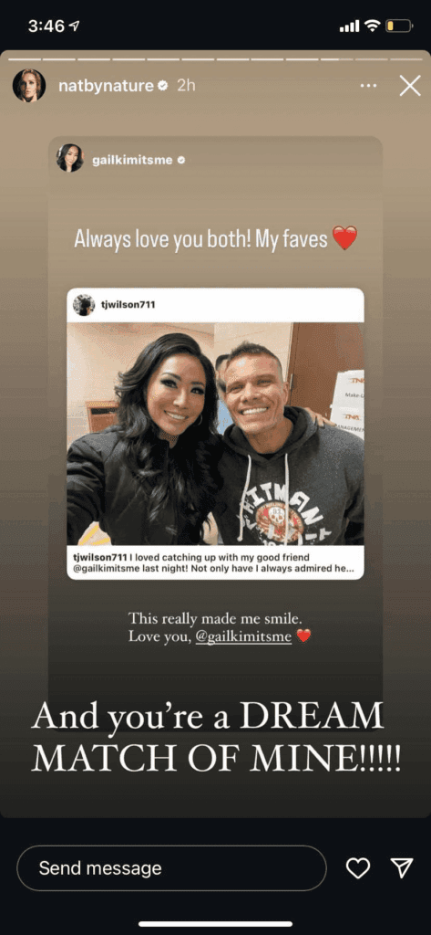 We are talking about none other than another highly regarded pioneer of the Women’s Revolution, Gail Kim. Natalya took to her Instagram story to post Gail Kim’s recent catching-up post with Nattie’s real-life husband, TJ Wilson (also known as Tyson Kidd).