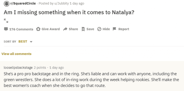 LooseLipsBackstage, a Reddit user who has proven their credibility replied to provide a glowing review of Natalya.
