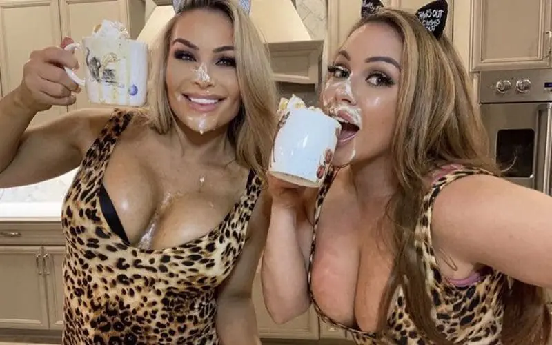 The Neidhart sisters had a little fun with pumpkin spice lattes, a seasonal favorite. While wearing matching big cat print clothes, Jenni and Nattie got some of that cream on them. The caption Nattie picked for the short teaser video encouraged fans to watch the whole YouTube video.