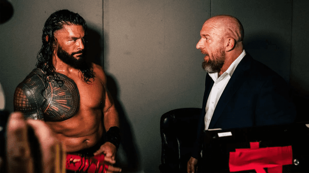 WWE recently uploaded several behind-the-scenes photos of the Money In The Bank Premium Live Event featuring several Superstars. One of the photos featured Roman Reigns and Triple H in a backstage area, as the two were having a talk prior to Reigns’ Civil War match.