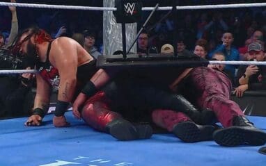 Eventually, Jacob Fatu sent Braun Strowman through that table in the ring with a hip attack. The two were wrapped up in a broken table as the referee counted and Jacob was able to get up before 10 as Strowman stayed on the mat.