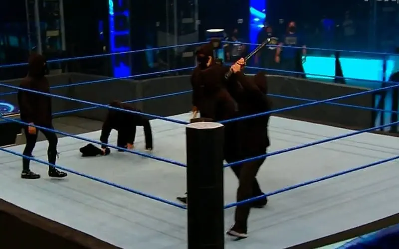 During the closing moments of SmackDown, a gang of hooded people rushed the ring with clubs. They ran everyone off including the announce team and cameramen. They attacked the NXT Superstars in the crowd and then they pulled out cans of spray paint.