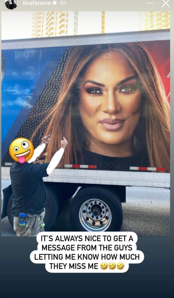 Jax recently took to her Instagram Stories and posted a photo of a person flipping her off on what appears to be an old picture of her on a WWE production truck. She put a sticker of this WWE employee’s face, but it’s still clear that WWE misses her, and they also apparently haven’t covered up her face on that truck wrap yet.