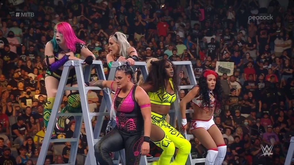 Alexa Bliss, Tamina, Asuka, Naomi, Nikki ASH, Liv Morgan, Natalya, and Zelina Vega all battled hard to reach the white Money in the Bank briefcase. Alexa Bliss walked into the match as the odds-on favorite, and her mind control techniques were utilized in the match as she took over Zelina Vega and caused her to climb down the ladder without capturing the briefcase. There was a lot going on in this intense match.