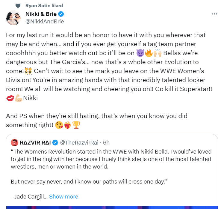 Nikki Bella and Brie Bella have left a lasting impact on women’s wrestling and continue to inspire young women and girls to pursue their dreams in the industry. Their contributions to the sport have been significant, and their legacy continues to be felt by fans around the world. Nikki Bella also responded to a fake Jade Cargill quote and it appears she felt punk’d after the truth came to light.