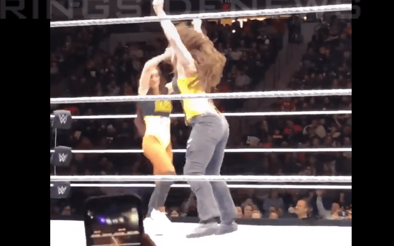 Carmella has a lot of fun with her dance breaks and R-Truth is usually by her side while she gets down for seven seconds. However, at WWE’s house show in Minneapolis, she had a different dance partner.