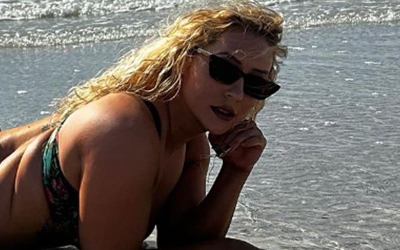 The NXT Superstar’s attire consisted of a printed two-piece bikini that showcased her toned physique. Nikkita Lyons also accessorized with stylish sunglasses to shield her eyes from the bright sunlight, and she wore her curly blonde hair down. She’s been quite busy recently, even doing a music video shoot.