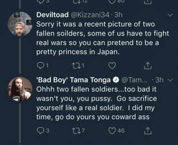 Things escalated quite a bit more, with the fan saying that he use to have a picture of two fallen army soldiers, and called Tama a fairy for “fake fighting.” Tama responded by saying he wishes it was the fan who was killed in action, and then reminded the world that he has served in the Air Force. The tweet has since been deleted. Someone fortunately…took a screenshot.