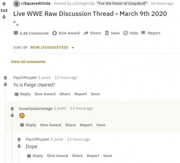 One Reddit user named PsychMuppet asked “Yo is Paige cleared?” in a Live WWE Raw Discussion Thread. This was answered by LooseLipsBackstage, a Reddit user who has previously established credibility.