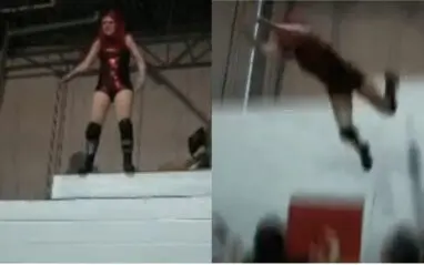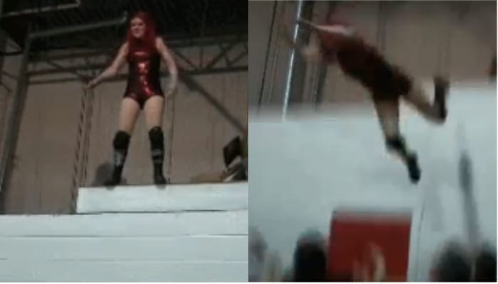 During the match, the 46-year-old took a leap off the stage high above the floor in the gym where the event was being held. Luckily, she had plenty of people to catch her but it was still pretty insane.
