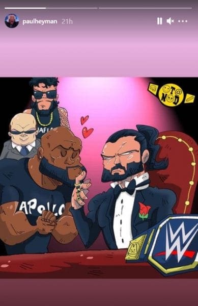 Paul Heyman sent out an Instagram story recently that included some fan art. This art depicted a cartoon Apollo Crews kissing Roman Reigns’ ring while Heyman and Jey Uso stand in the corner.
