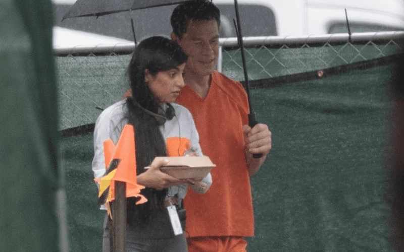 John Cena’s movie career is taking off and he’s currently filming yet another franchise. Suicide Squad two was recently filming in Atlanta and a photographer was able to snap a pic of Cena while wearing some orange.