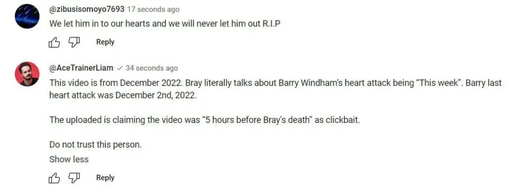 Another fan sent out a warning that the YouTube account in question cannot be trusted, as they said, “This video is from December 2022. Bray literally talks about Barry Windham’s heart attack being ‘This week.’ Barry last heart attack was December 2nd, 2022. The uploaded is claiming the video was ‘5 hours before Bray’s death’ as clickbait. Do not trust this person.”