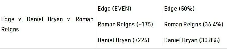 Current betting odds indicate that Roman Reigns is sitting at +225 odds and Daniel Bryan has +175 odds. Edge’s odds are currently even. That means Bryan has a 30.8% chance of winning and Roman Reigns has a 36.4% chance of winning. Edge’s chance of winning is at 50%.