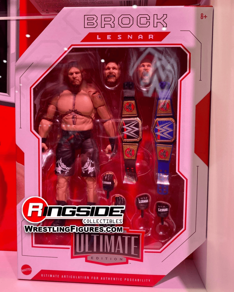 Reddit user u/BigUllie has shared a photo of a new Ringside Collectibles WWE action figure. The photo shows that Brock Lesnar has both the WWE and Universal Championship belts as accessories.
